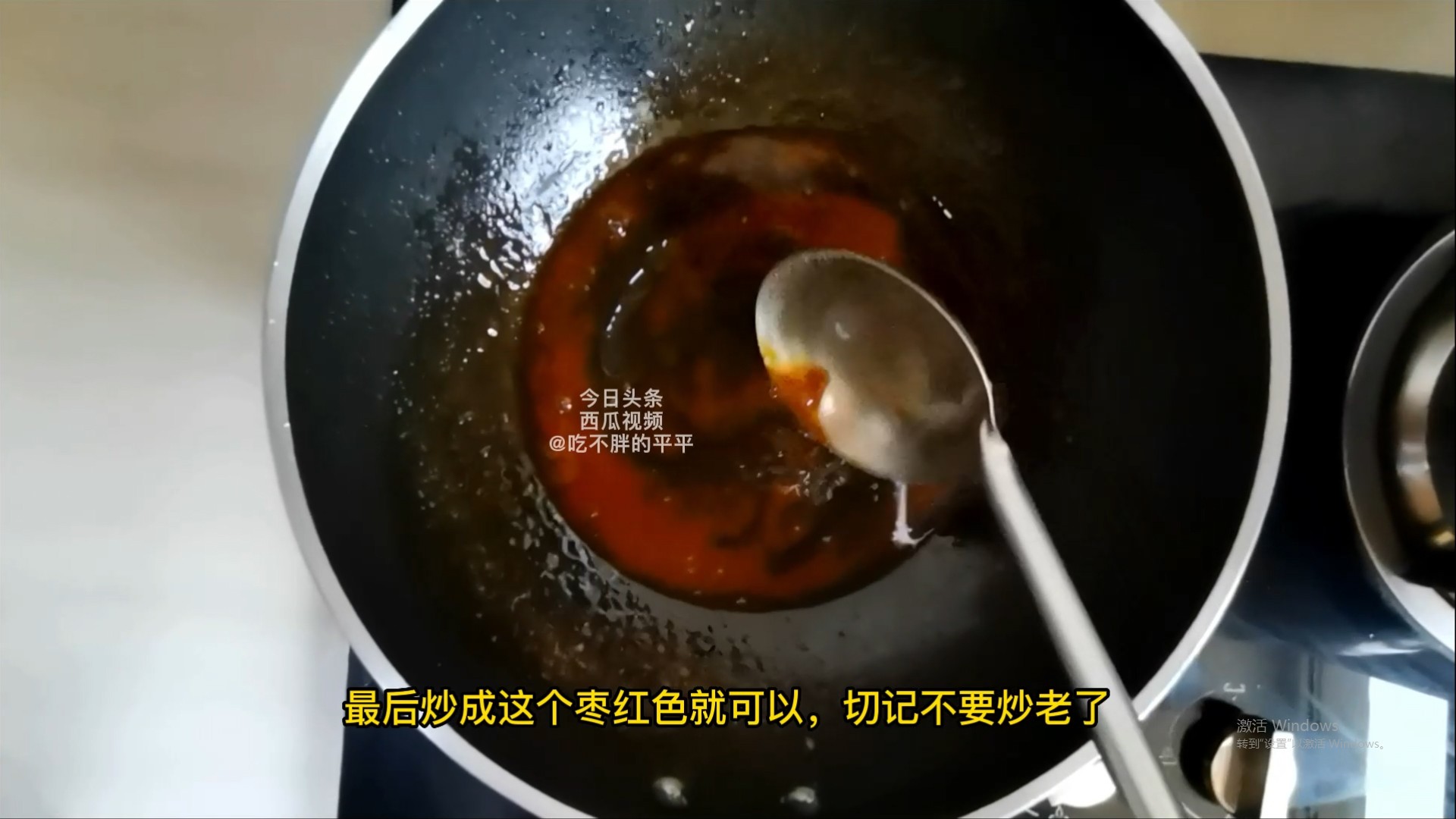 接下来就是炒糖色,做红烧肉,要想色泽红亮,糖色少不了,锅中加入少许食用油,加入白糖适量。开中火把这个白糖炒化,一边炒一边翻动,使这个白糖受热均匀,做红烧,肉的糖色要炒得嫩一点,最后炒成这个枣红色就可以。
