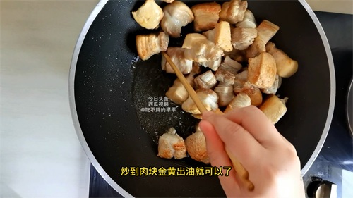 锅中加入少许食用油,冷油下锅倒入切好的五花肉块,开中火煸炒,把五花肉里面的油脂炒出来,炒到肉块金黄出油就可以了,切记不可炒制时间过长