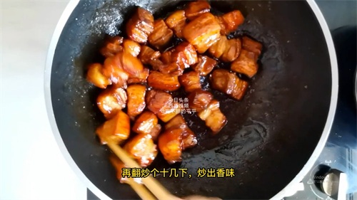 这时候立马倒入煎好的五花肉,用勺子快速翻炒,让五花肉均匀地裹上糖色,再翻炒个十几下,炒出香味,看,这个颜色非常的有食欲。