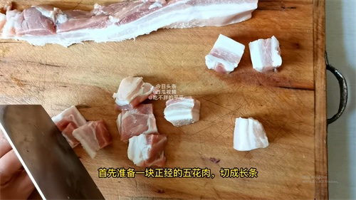 首先准备一块儿正经的五花肉,切成长条,再切成大小均等的四方块,一定要切得大一点,因为做好之后这个肉块会缩水变小