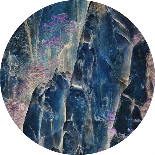 在这幅作品中,圆形的画幅让照片更趋向中国山水画作的意境和形式感。画面中山石斑驳耸立,花枝俏丽点缀其间,不同于眼见为实的世界,不过是一块岩壁,也生出更丰富的肌理和耐人寻味的色彩。摄影师巧妙地利用线条和色调控制着观者的视线,光与影已被转换成了明与暗的节奏,形与物已被幻化成可以用眼睛去触摸、可以用心灵去体验的意象。不同于传统的摄影形式,摄影师采用一种更加自由的创作手段来表现自我,也正是如此才构成了他作品中的当代性。如摄影师所说:“一般都认为摄影是‘光与影’的艺术,而在我的作品中,光与影是不存在的,也可以说,摄影是不存在的。画面有的是斑驳的现实世界,以及由幻象所构成的意象的影子。”
