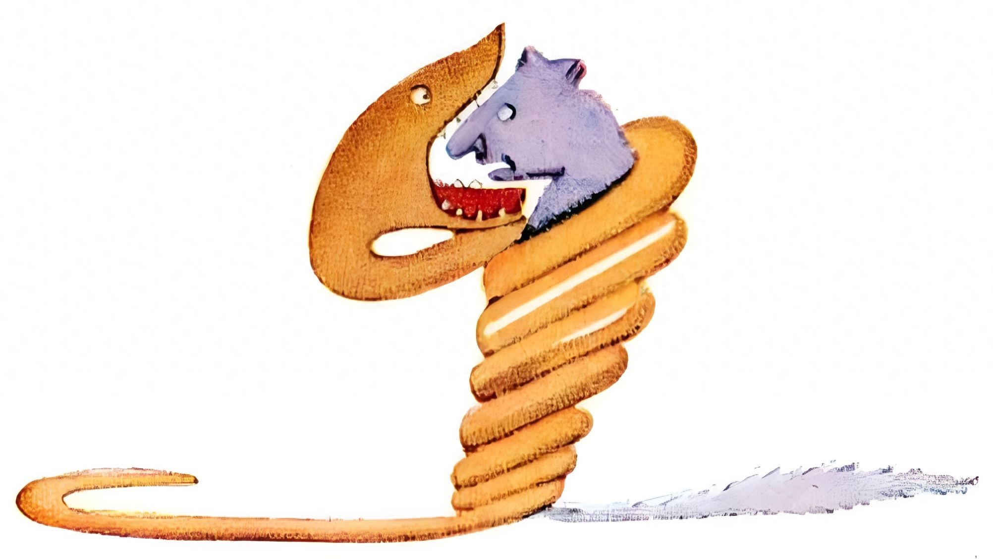书里说:“蟒蛇整个吞掉它的猎物,连嚼也不嚼一下。接下来它会一动不动,睡六个月来把这些食物消化掉。”