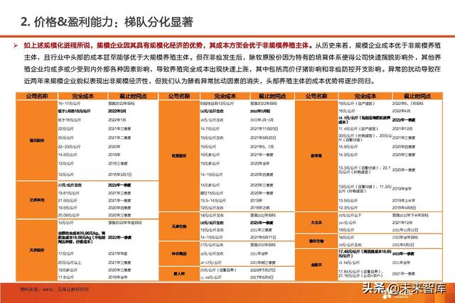 从历史来看,规模企业成本优于非规模养殖 主体,且行业中头部的成本甚至能够优于大规模养殖主体。但在非瘟发生后,除牧原股份因为特有的培育体系使得公司快速摆脱影响外,其他养 殖企业均或多或少受到内外部各种因素影响,导致养殖完全成本出现快速上涨,其中包括高价仔猪影响和非瘟防控开支影响。