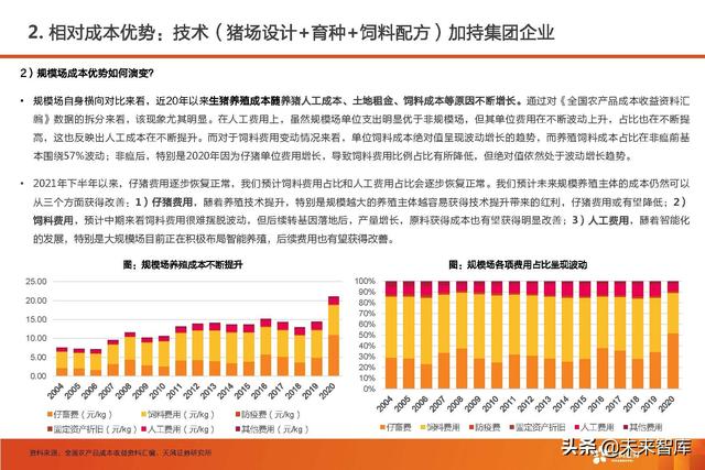 规模企业成本长期仍处于行业领先位置。长期来看,规模场的养殖成本控制能力始终优异于非规模场,而且优势在2010年前后开始逐步扩大,并 在2012年后成本差异逐步拉开至2元/kg。虽然本轮周期中由于集团场扩张速度过快带来的摊销成本高、员工工资提高、养殖效率下降引发了规模 不经济现象。但随着规模企业外购仔猪、母猪的逐步摊销,目前规模企业养殖成本已回归行业正常水平,且随着后期稳定生产后的生产效率恢复、 饲料采购渠道占优、疫情防控体系优越等方面的逐步凸显,规模企业的成本或将重回行业领先位置。(报告来源:未来智库)