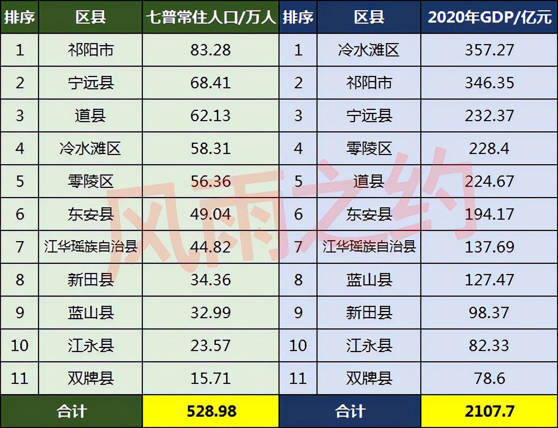 冷水滩区常住人口为58.31万人,零陵区常住人口为56.36万人,与六普相比,冷水滩区增加9.51万人,零陵区增加3.09万人。冷水滩区位于永州市北部,是永州市的政治、经济、文化、科教、交通、传媒、通信和金融中心,2020年全区GDP总量为357.27亿元,是永州市GDP最高的区县,服务业是全区经济的支柱,农业也比较发达,工业实力比较薄弱。
