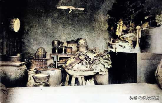 一户当地人家的厨房内景,空间狭小,室内摆满了水缸、蒸笼及簸箩等应用之物,簸箩上堆放着杂物和一把蔬菜,近景是一块很大的案板。