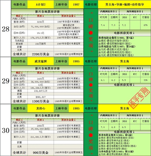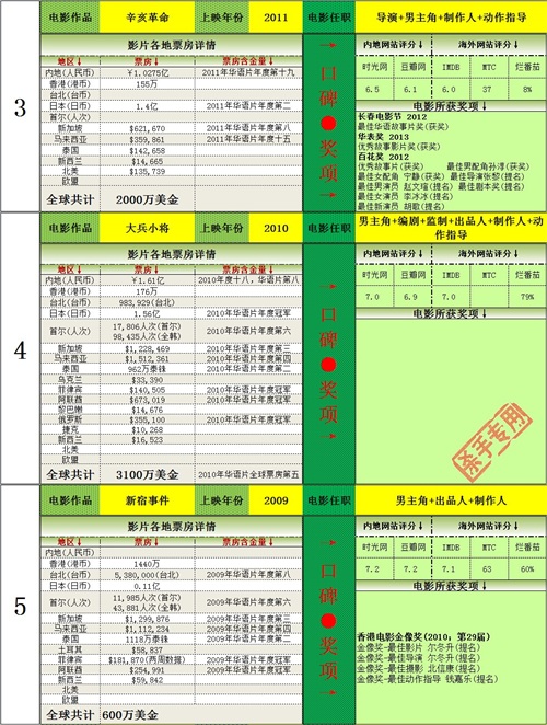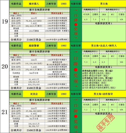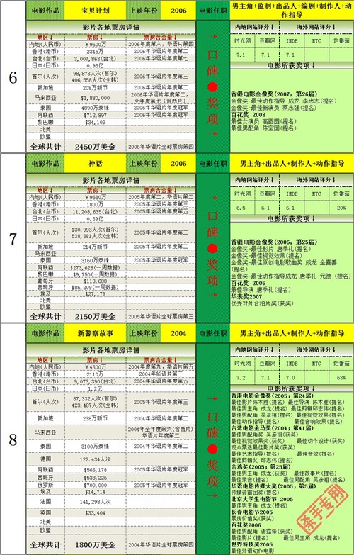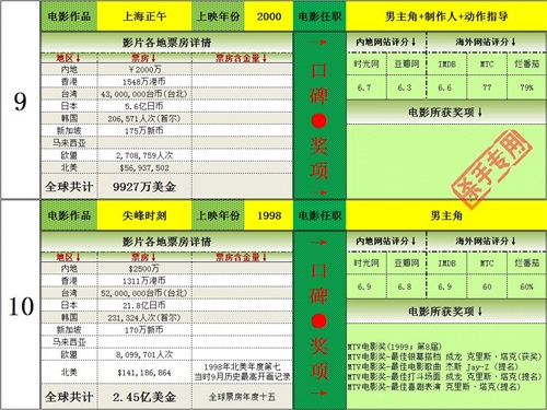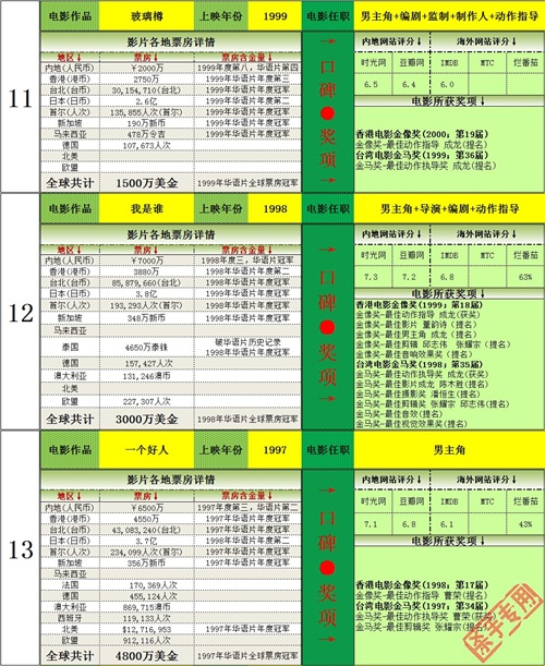 3.有11次杀入年度外语片前十,19次获得华语片年冠,均为华人第一。
