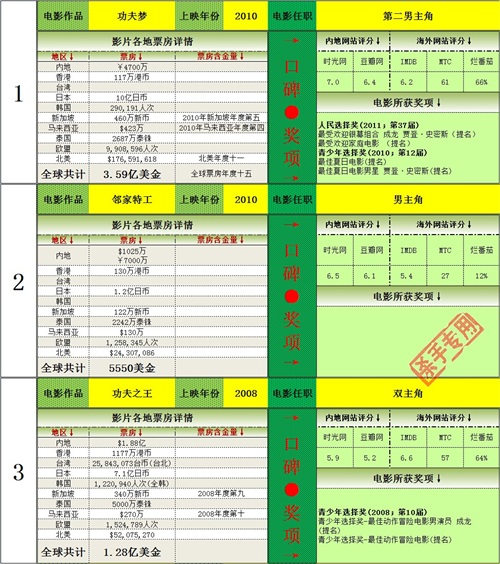 2.3次华语年冠,其中一次年度总冠军(含西片),红番区破港片记录。