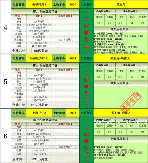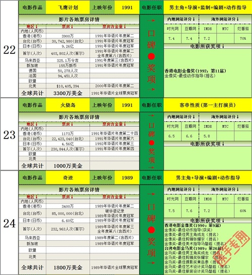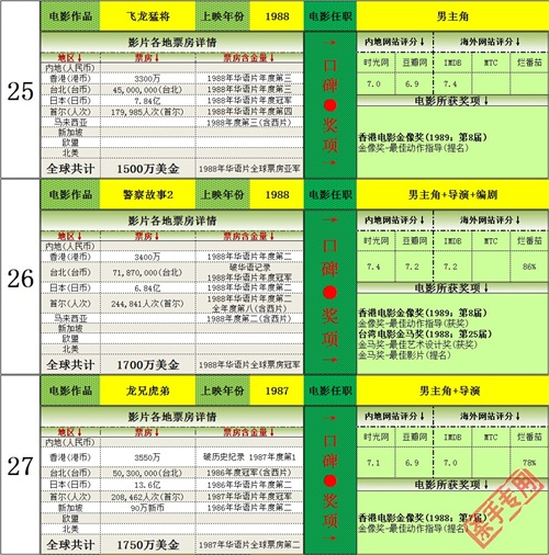 2.打破韩国历史记录一次,14次打入韩国年度排名前十(含西片),获得16次华语年冠(目前警察故事2013为2014年华语片年冠,加上的话17次),均为华人第一。