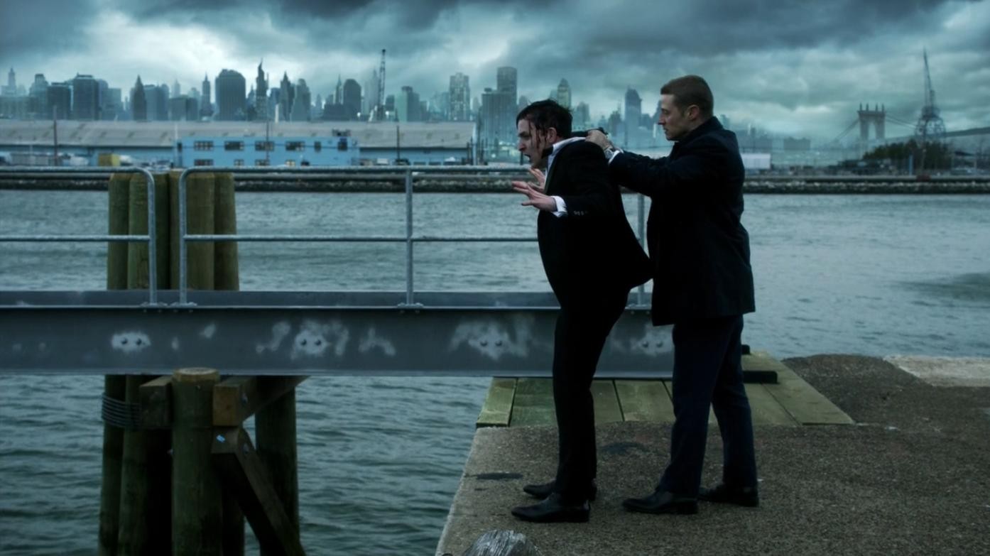 很快他们在大高个家里找到了那串项链,确认了是大高个杀害了韦恩夫妇,已经被杀死归案了。这件事上了新闻大家都很开心,说实话我觉得有些仓促,这么多项链怎么就能确认是韦恩夫人的那一条验了指纹了吗?而且大高个死了也死无对证,根本没有审讯过,这不!菲什的手下企鹅赶紧偷偷地去告密,他告诉了重案组的蒙托亚和艾伦,说大高个是被菲什和警察陷害的。那串项链其实是菲什放进大高个的家里的,而这件事发生在布洛克和菲什见面过后,蒙托亚和艾伦幸灾乐祸,他们问企鹅为什么背叛菲什,企鹅谎称是因为韦恩那个可怜的孤儿唤醒了他的良知。