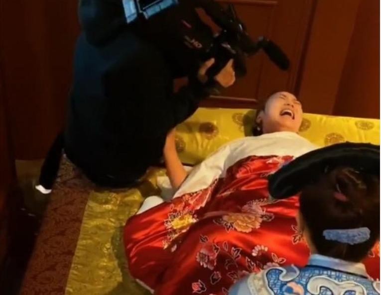 在一部古装剧的拍摄中,一位女演员正在上演生孩子的戏码,只见她躺在床上,双手抓着棉被,床前有几位摄影师扛着镜头拍特写,虽说女演员已经尽力想演出痛苦的感觉,但一旁的导演却并不满意。