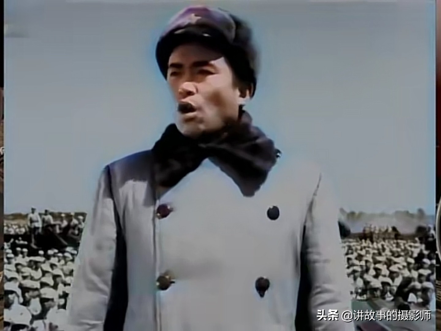 在部队和群众的欢呼声中,师长站在缴获的坦克上讲话: