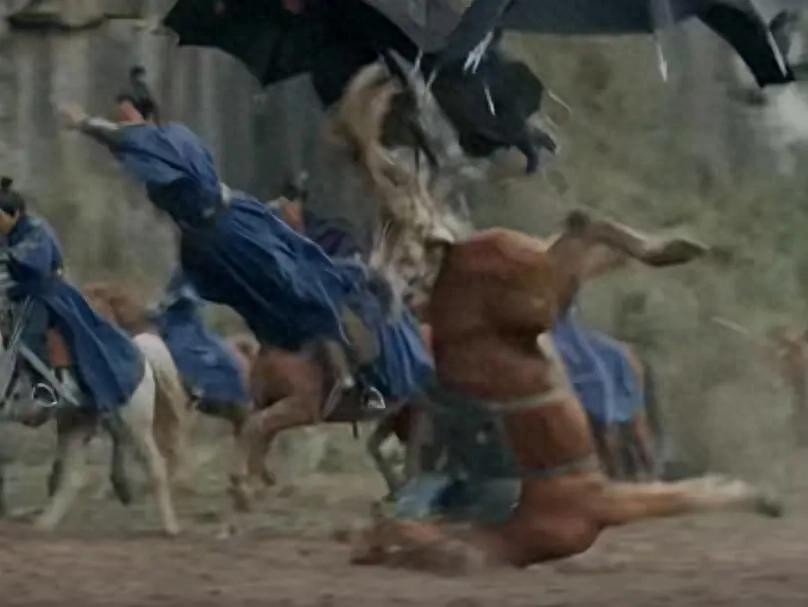 从画面中能够清晰看到,马匹向前卧倒后马脖子几乎扭到了90度,而骑在马上的演员则被威亚吊着直接飞了起来,因为时间点掌握的很好,所以人应该没什么问题,但马摔倒的姿势让人不免担心,这样扭脖子真的不会断吗?