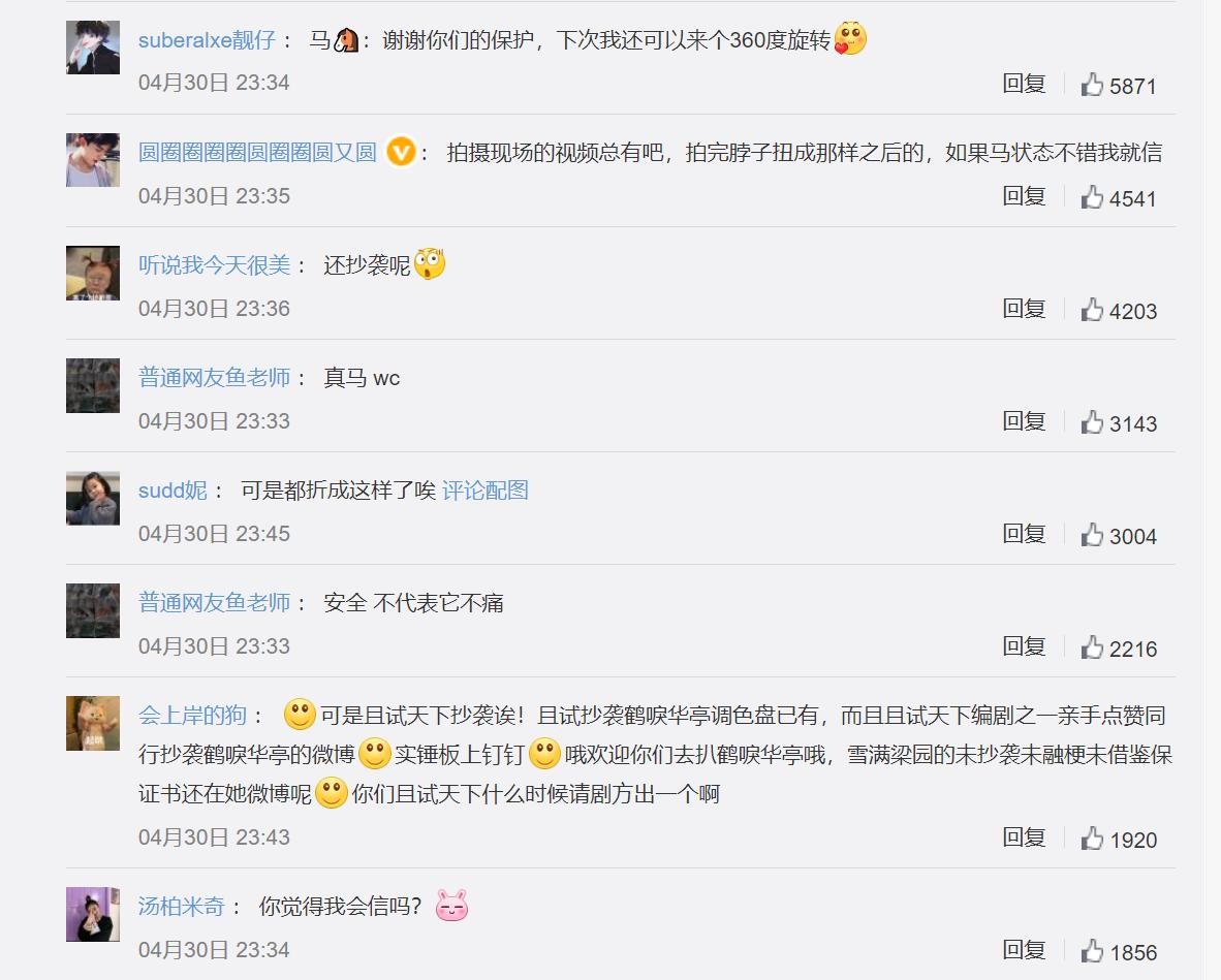 其次,这件事不排除有幕后团队故意炒作、煽动舆论。《且试天下》中摔马的镜头出现在电视剧的前两集,电视剧4月18日播出,为什么当时没有舆论发酵,而是过了十多天才又被人拿出来说?并且在特技团队回应了之后,依然不依不饶,而对于摔马这件事,在《且试天下》之前从来没有过相同的争议。
