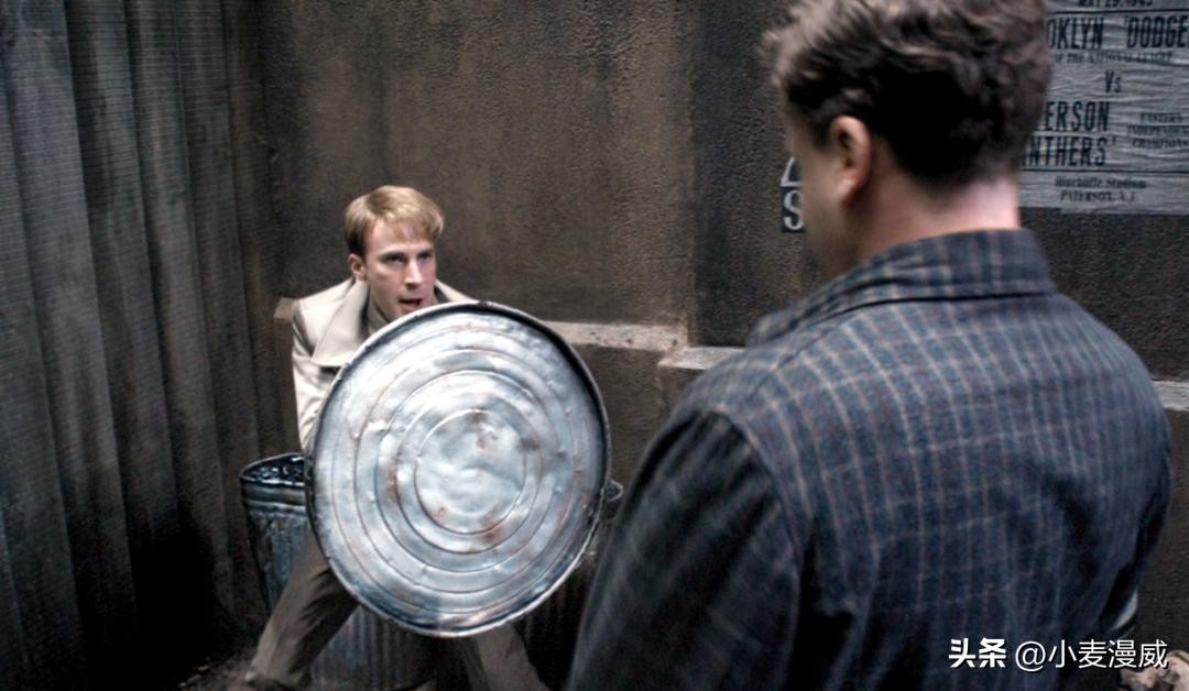 喜欢“多管闲事”的史蒂夫,三天两头就被小混混暴揍,在一次殴打中,瘦小的史蒂夫拿起身旁垃圾桶的盖子进行防守。