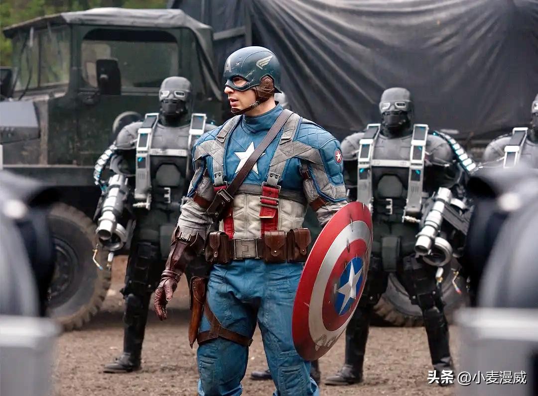 军方不仅为史蒂夫定制了一套红白蓝条纹紧身衣,还给他配备了一个绘有星条旗图案的传统盾形盾牌。