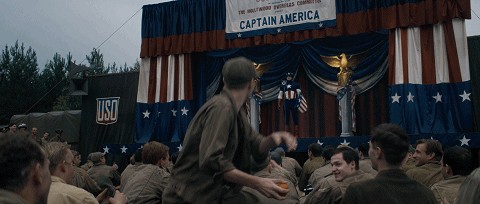 成为超级士兵的史蒂夫,并没有被美国军方派到战争第一线,而是让史蒂夫同众多舞娘一起,为前线战斗的士兵表演节目、鼓舞士气。