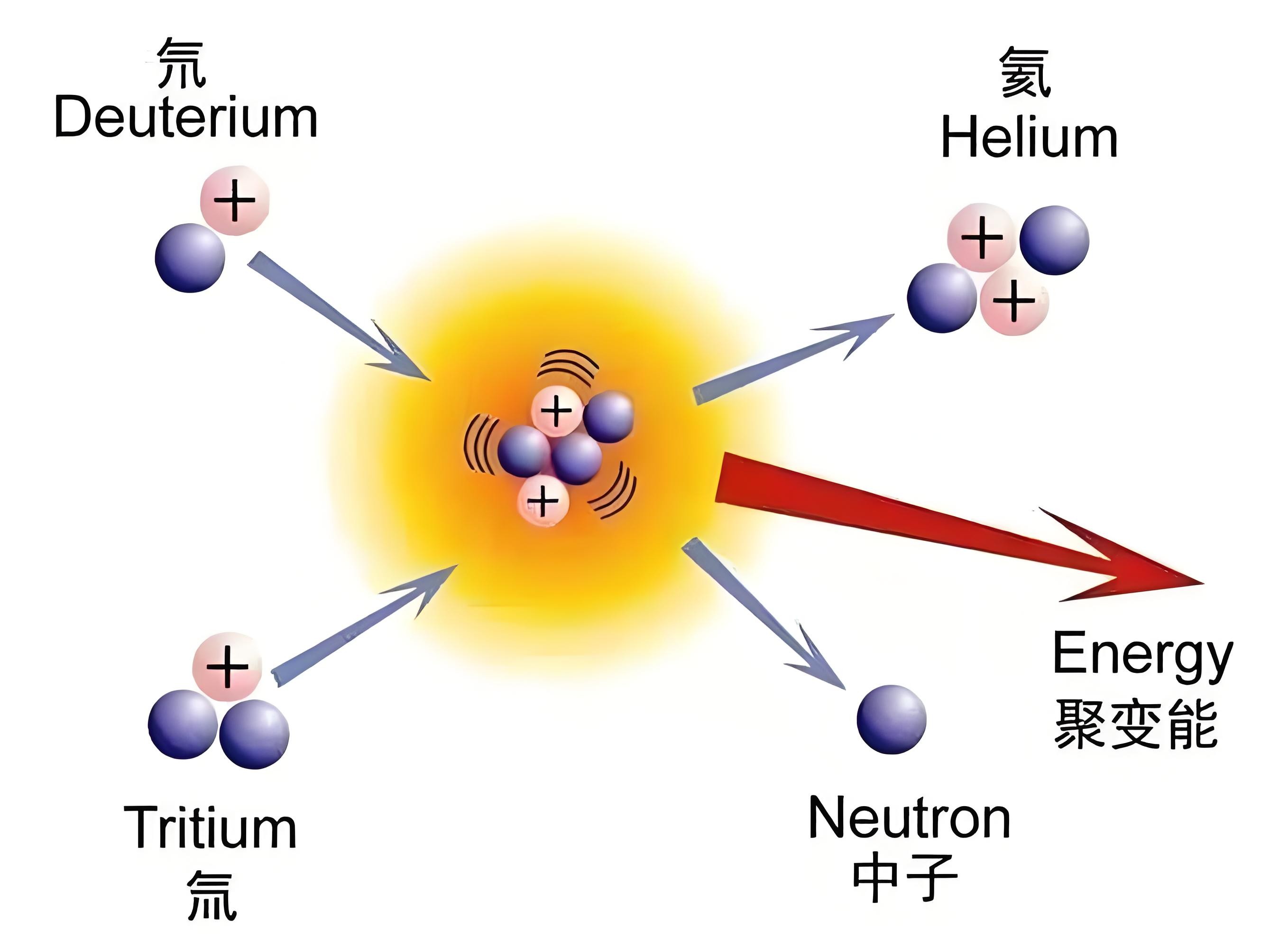 人类通过科学研究观测到的核聚变反应,通常是由氢的同位素氘和氚的原子核结合成较重的氦原子核,并在这一过程中释放出巨大能量。在核聚变反应前后,质子和中子的数量始终保持不变。