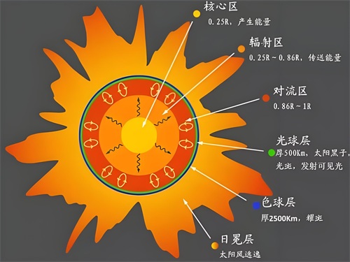 在这个炽热的核心区域,每时每刻都在进行着氢核聚变成氦核的核聚变反应,释放出巨大的能量,如同一个永不熄灭的超级熔炉。辐射层处于日核与0.7倍太阳半径的区域之间。