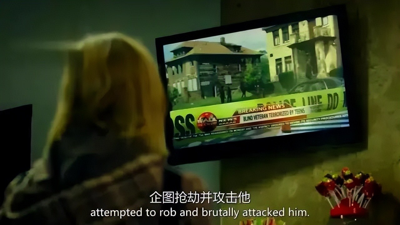 结尾,飞机场电视新闻报道中,则是两个歹徒闯进盲人退伍军人家中,老头正当防卫杀死歹徒的英雄事迹,他却没敢透露女主角抢钱跑了,隐藏了自己变态罪行!