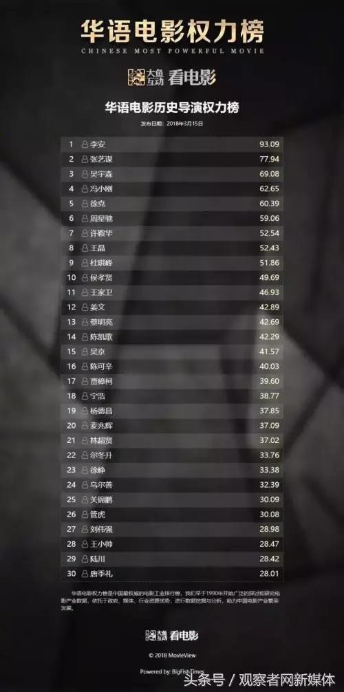 华语电影导演权力榜出炉,这个榜单大家认同吗?