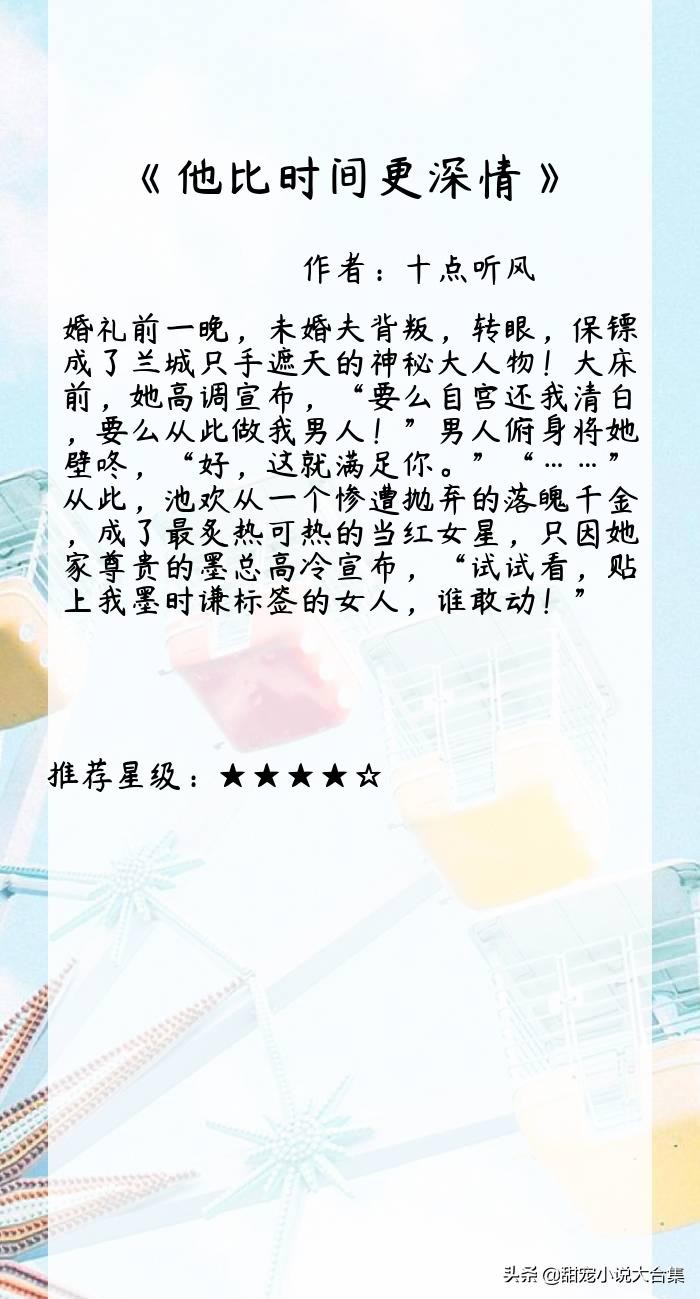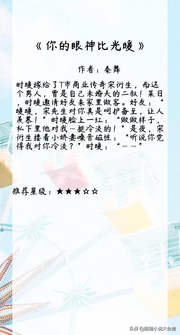 分享的时间结束的就是这么的快,一眨眼这几本小说莫莫就分享完了,不知道还合不合你的口味呢。除了《他比时间更深情》之外,莫莫还强推《你的眼神比光暖》呢,都是有肉有剧情的优质小说,等你来看!