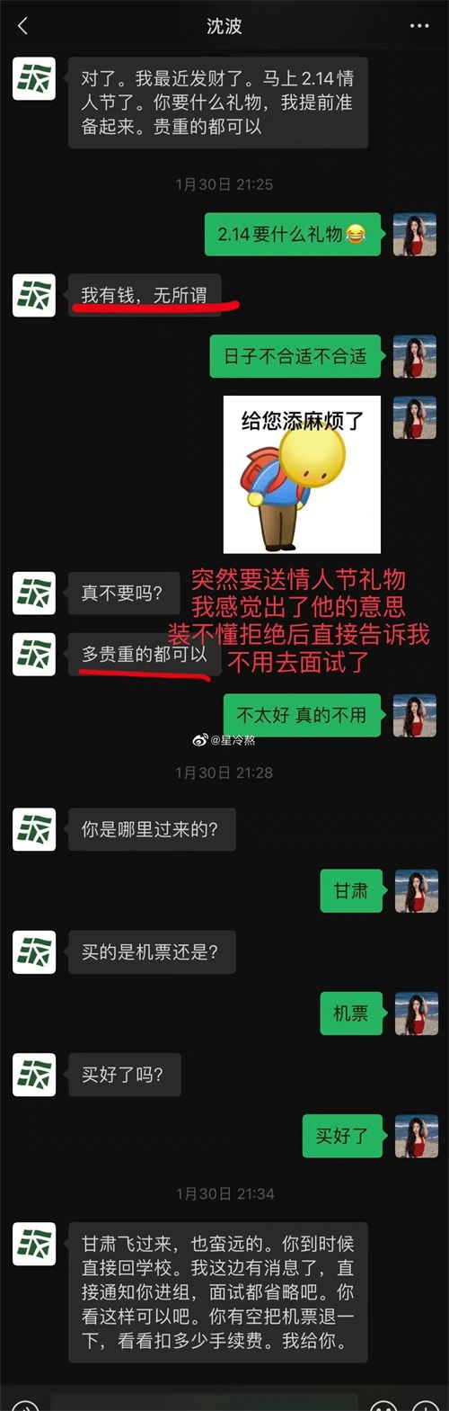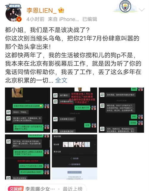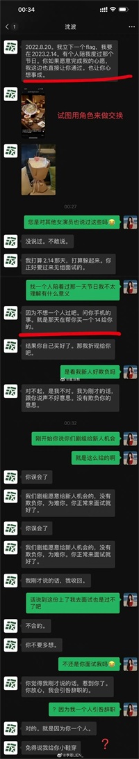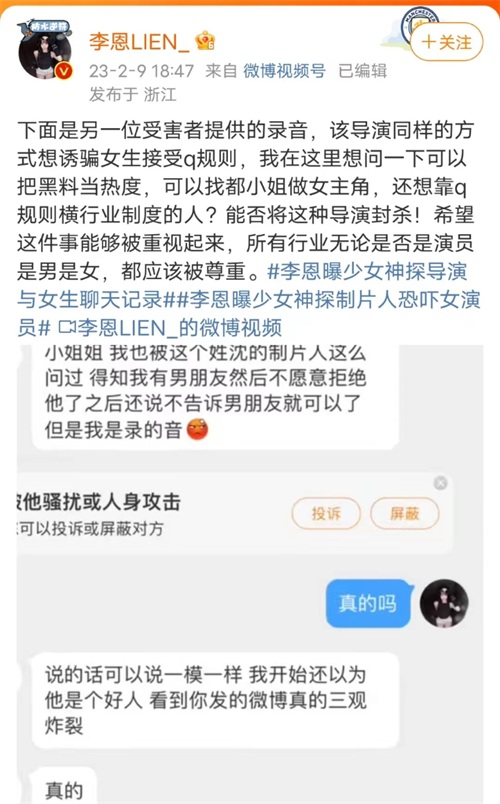 Zhong(不知道是不是指李恩?)明知自己面试通过概率不大,且抓住沈导“把柄”,遂采用恶意截图,通过炒作,增加自己的曝光度。当初跟剧组沈导微信沟通时,告知,为了火可以用尽一切手段,其中包括拍摄擦边短视频。
