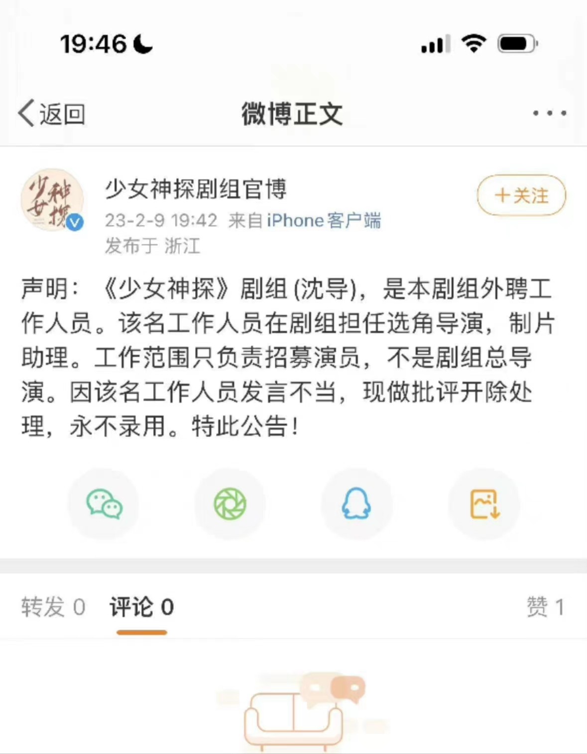 而爆料者李恩在内容中提到这位网剧导演,正是都美竹即将开拍的新戏《少女神探》的导演。