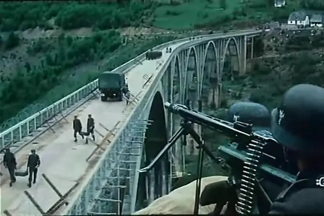 1944年二战末期,德军重兵把守南斯拉夫境内的一座大桥,前后峡谷沟壑,此为交通要道。德国党卫军上校霍夫曼博士接到上级命令前来视察,为防止游击队偷袭炸桥,下面布满地雷,两侧部署带电的铁丝网,一有入侵就会引发警报,而且哨塔机枪火力密集,可以说防守的天衣无缝,固若金汤。