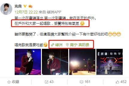 12月7日,他在微博上晒出了自己在广西宾阳演唱的视频,舞台是露天的,而且非常简陋,但他却表示这样特别有气氛。