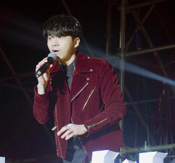 当天的光良身穿一件酒红色外套搭配一条灰蓝色休闲裤,寒冷的夜色下,可以清晰地看到光良脸上的皱纹。
