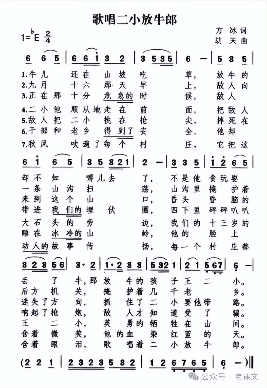 “老课文”公众号在网上找到了方冰作词的《歌唱二小放牛郎》,这是一首“叙事歌”,叙述有头有尾,描写也比较生动,把它当作课文的原型是可以的。