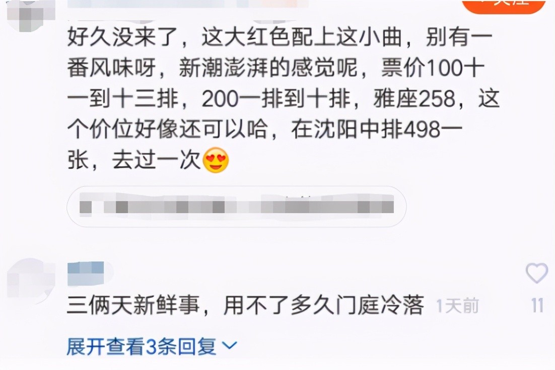 其实如果是很喜欢看的演出,相信门票贵一点大家也是心甘情愿买的。所以嫌门票贵的网友可能只是觉得性价比不高吧。这也说明了现在的刘老根大舞台吸引力确实没有之前受欢迎了。