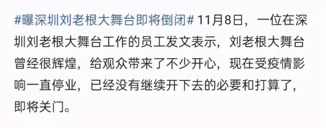 几天前,网上还有传闻说深圳的刘老根大舞台打算关门,据说是深圳刘老根大舞台的工作人员发文表示,因为疫情的影响一直停业,现在已经没有再开下去的必要和打算了。