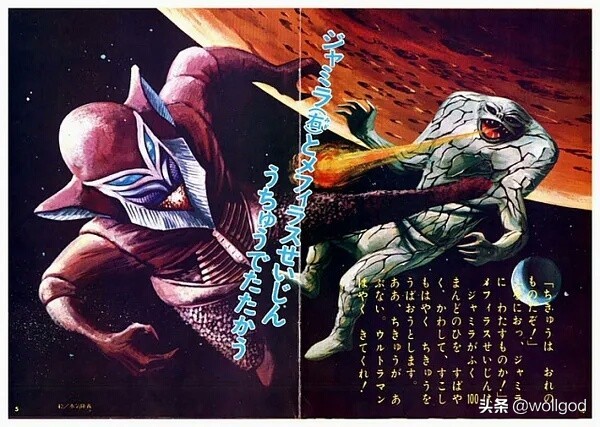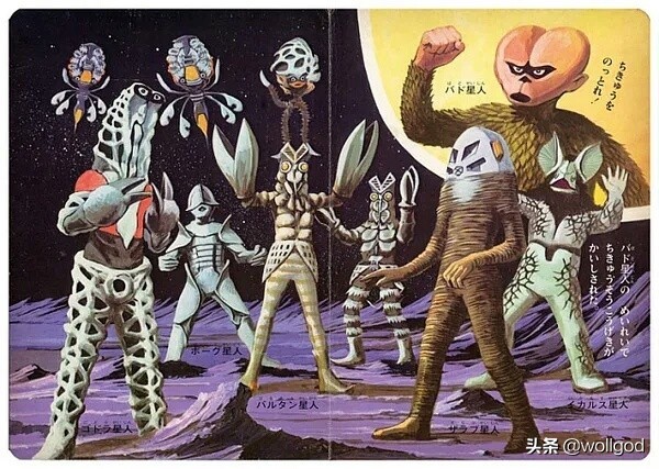 在早期的时候,《奥特曼》系列的各种插图画风有着画报的感觉,充满了复古而质朴的美(浓浓的古早风),怪兽们也相当有特色。画风是下面这样的: