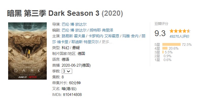 《暗黑》是一部科幻/悬疑片,已经推出3季,第1季8.9分,第2季9.3分,第3季9.3分。