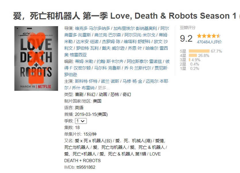爱,死亡和机器人 第一季 豆瓣9.2分