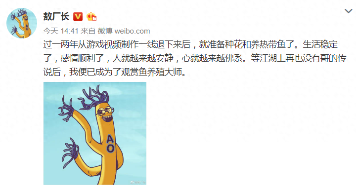 在今天《囧的呼唤》系列视频制作者敖厂长发了一条微博,称自己在一两年后从游戏制作的一线退下后,要开始种花养鱼的生活了。