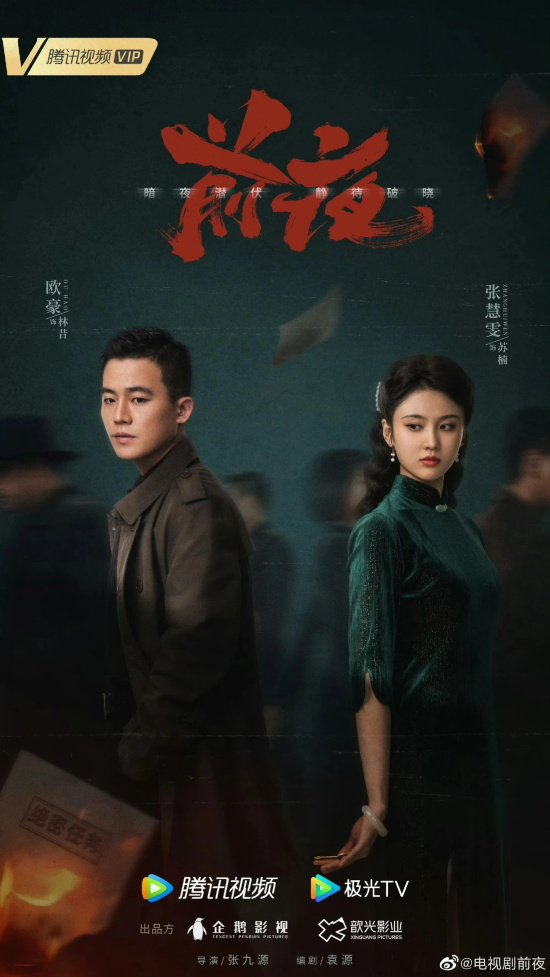 由欧豪、张慧雯、赵志伟主演的传奇年代剧。讲述了聚焦于社会动荡年代下帮会成员林昔(欧豪饰)、进步女学生苏楠(张慧雯 饰)等爱国青年,面对国家存亡,意识觉醒投身红色革命,于沧海横流之中锤炼成长,其命运情感也在时代洪流下伴随家国命运而羁绊沉浮[2]。《前夜》作为时代谍战题材,节选了1941年上海租界孤岛时期,1948年锦州战役前以及1949年上海解放前的三个历史阶段为背景,将叙事结构分为三段,以林昔、苏楠为代表的隐蔽战线的无名英雄们,在国将不国、风雨飘零的时局下挺身而出,坚决斗争。剧集以青年们的革命历程为故事主线,展示了抗战时期风云波谲的隐秘对战和暗夜危机,折射了特殊时代背景下革命工作者追求光明理想的曲折道路。