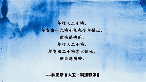 22 年收入二十镑,年支出十九镑十九先令六便士,结果是快乐。年收入二十镑,年支出二十镑零六便士,结果是痛苦。那样,花就谢了,叶就萎了,太阳就西沉了,只留下一片凄凉景象,这一来 一这一来,简而言之,你就永远给打败了。
