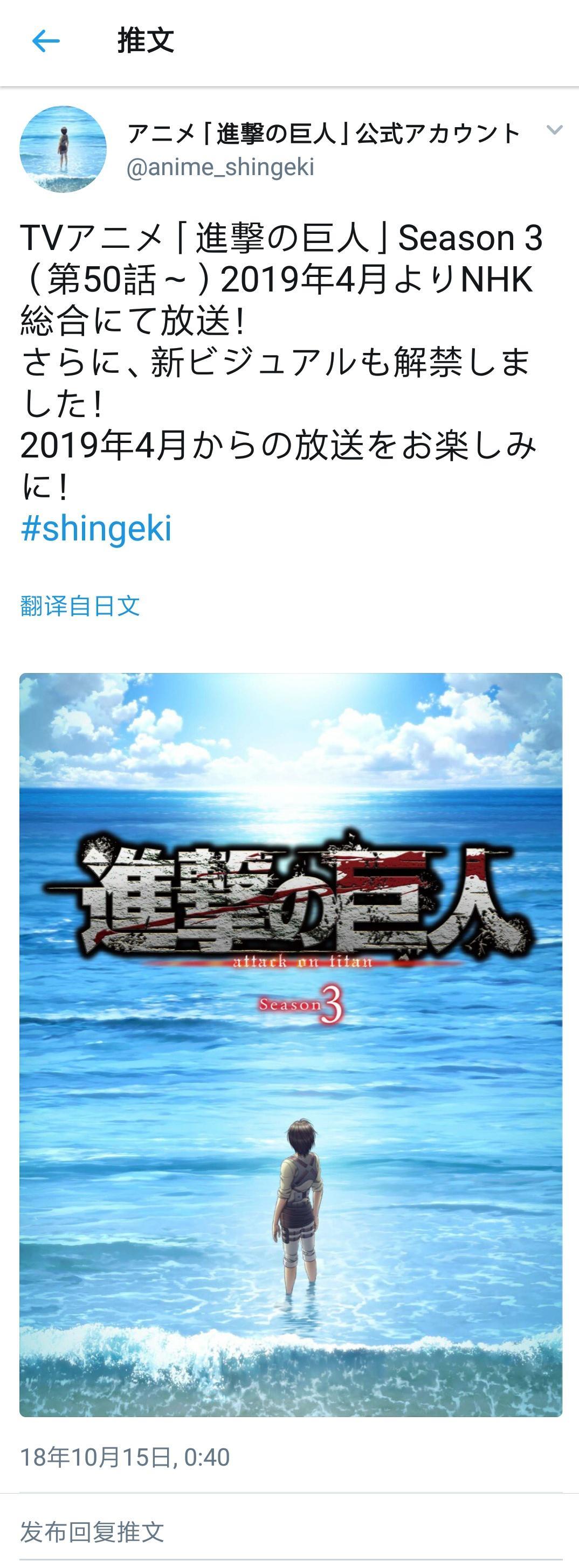 官方推特上的消息大概是这样的:《进击的巨人》第三季13话(第五十话)将于2019年四月播放。