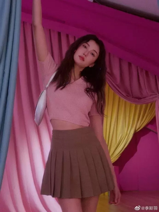 美女主播李斯羽身穿粉色上衣,搭配棕色短裙。