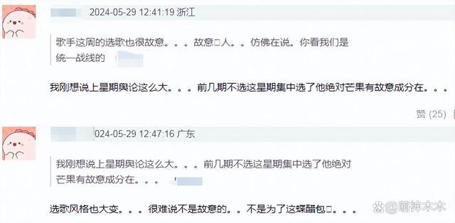 而湖南台的反应更是被吐槽故意恶心网友。在已公开的 6 首歌单中有 2 首是周杰伦的歌曲,而周杰伦正因为没有转发 " 台湾回归祖国怀抱 " 的立场微博饱受质疑,有网友认为此时节目组选择周杰伦歌曲的行为很刻意,似乎是为了跟舆论对着干,为了一碟醋包饺子。不然早不选晚不选,偏偏选在黄宣立场问题后,未免太巧合了。