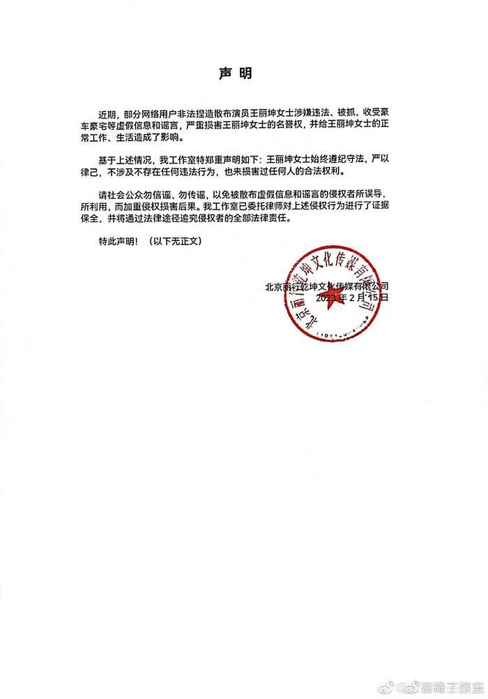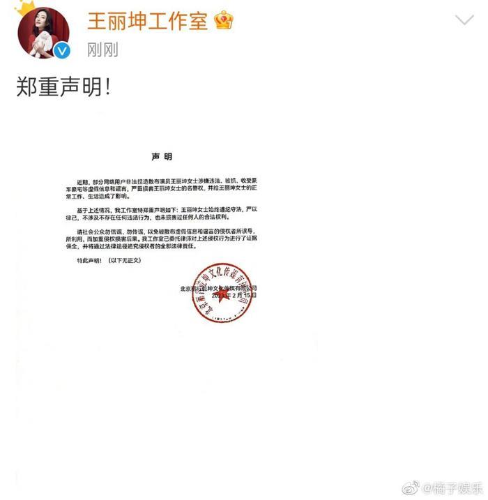王丽坤工作室发声明了,称网传王丽坤涉嫌违法、被抓、收受豪车豪宅都是谣言