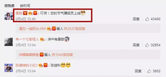 而景甜和张继科也有互动:叮咚!您的节气播报员上线。