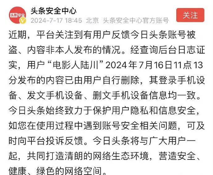 随后更打脸的来了。官方发文回应陆川被盗号一事,称那条吐槽的微头条是用户自行删除的,不存在盗号一说。