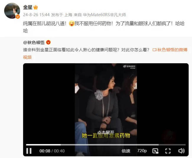 近日,网传金星服用激素药物导致不可避免的健康隐患与副作用,金星看到后转发回应:“纯属在那儿胡说八道!我不服用任何药物!为了流量和眼球人们都疯了!哈哈哈。”