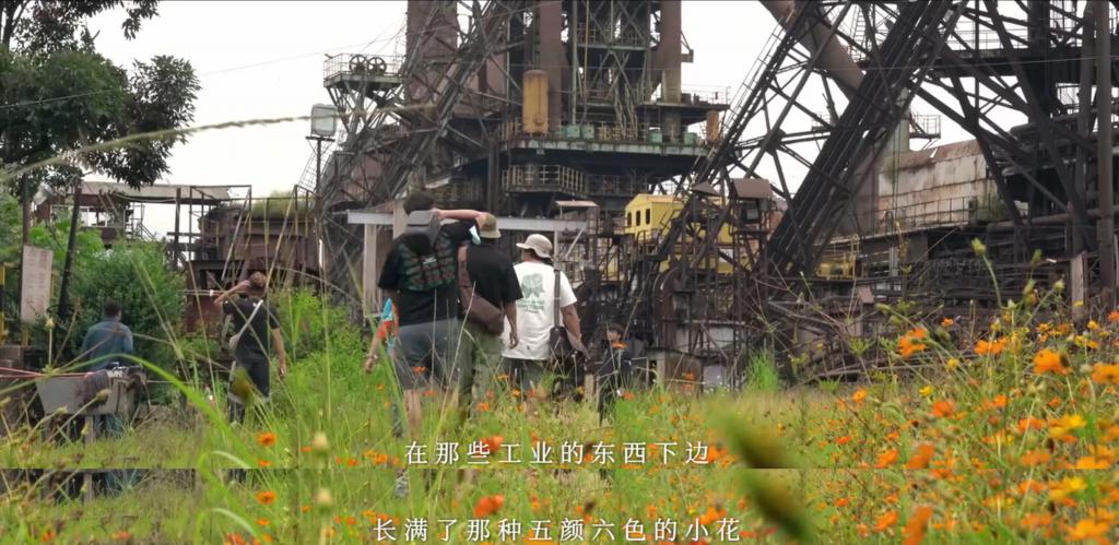 即便在厚重、庞大、冰冷的老工厂下,也充满绿意,开着生机盎然的小黄花。