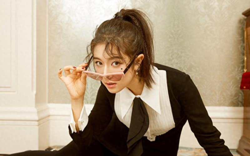 - 江疏影尝试短发造型,皮质西装搭配学院派褶裙,演绎别样的风情