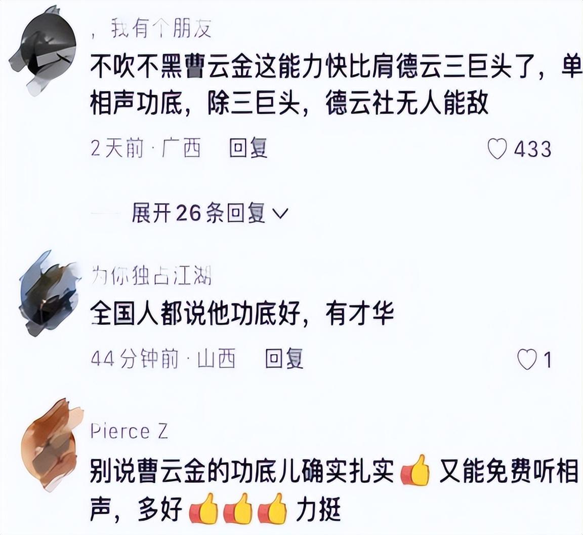 评论区网友也表示,曹云金如今的水平已经要比肩德云社的三巨头(郭德纲、于谦、高峰)了。